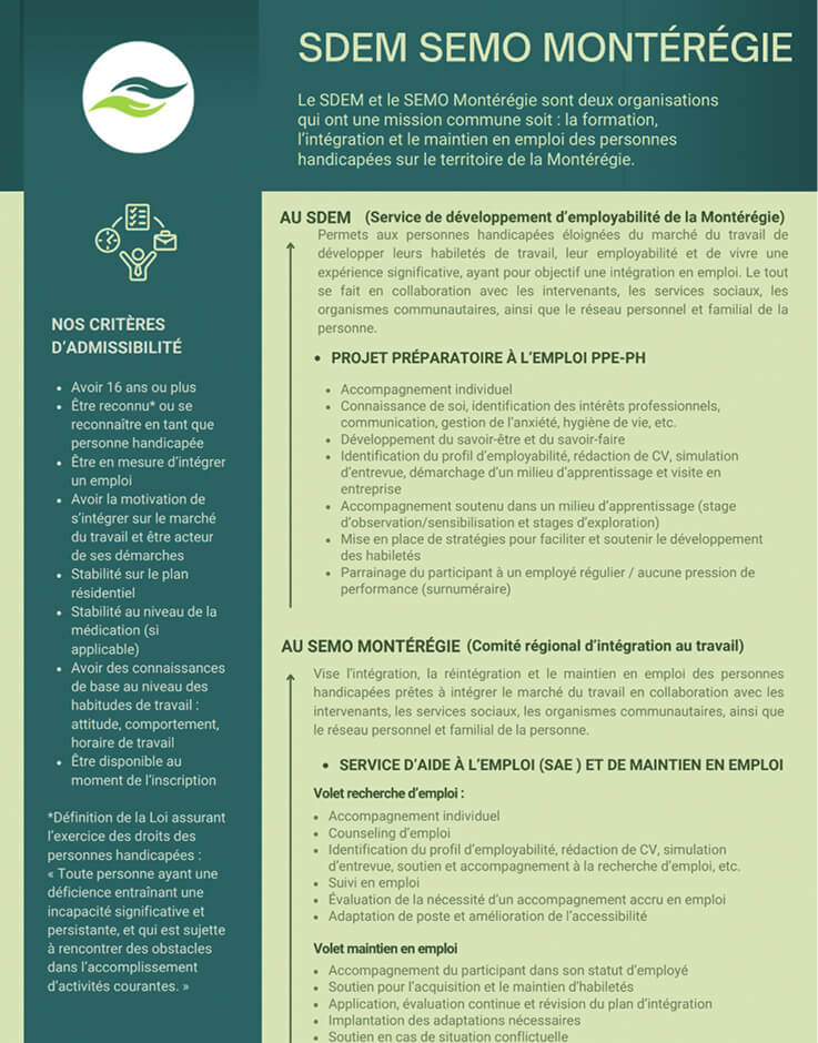 Communiquez avec nous au 1-800-646-6096 pour prendre rendez-vous. Vous pouvez également communiquer par courriel à l’adresse suivante: info@sdem-semo.org.